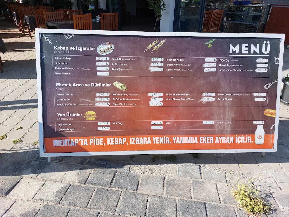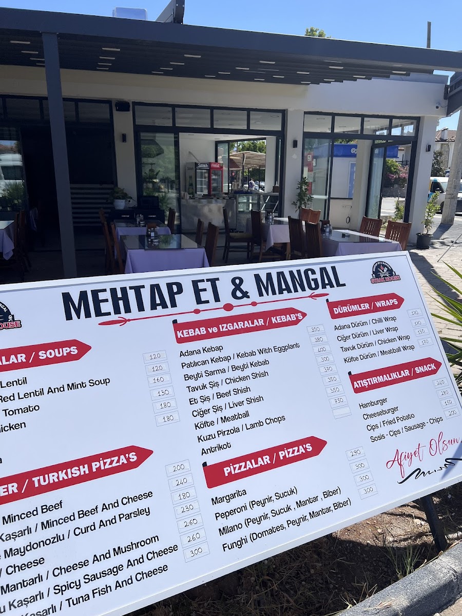 Mehtap Et & Mangal offers a diverse and satisfying menu, perfect for lovers of Turkish grilled dishes and comfort food. Their Kebaplar & Izgaralar section features classic choices like Tavuk Şiş, Tavuk Kanat, and Urfa Kebap, with options such as Adana Kebap and Izgara Köfte rounding out the offerings. For those preferring soup, the menu includes warming bowls of Ezogelin Çorbası and Mercimek Çorbası. The Fırın Ürünleri section boasts freshly baked options like Lahmacun and a variety of savory pide, including Kuşbaşılı Yumurtalı Pide, Sucuklu Kaşarlı Pide, and Tavuklu Pide. If you’re in the mood for a wrap, the Dürümler offer flavorful choices like Ciğer Şiş Dürüm and Adana Dürüm. There’s also a selection of light and refreshing salads such as Ton Balıklı Salata and Çoban Salata, along with savory appetizers like Antep Ezme and Haydari. For pizza lovers, the restaurant serves medium-sized pies like Funghi Pizza and Milano Pizza, as well as a unique Ton Balıklı Pizza. To top it all off, they also offer Poşet for a fun and distinctive treat. Whether you're craving grilled meats, hearty soups, or fresh salads, Mehtap Et & Mangal delivers an extensive and satisfying menu for all tastes.